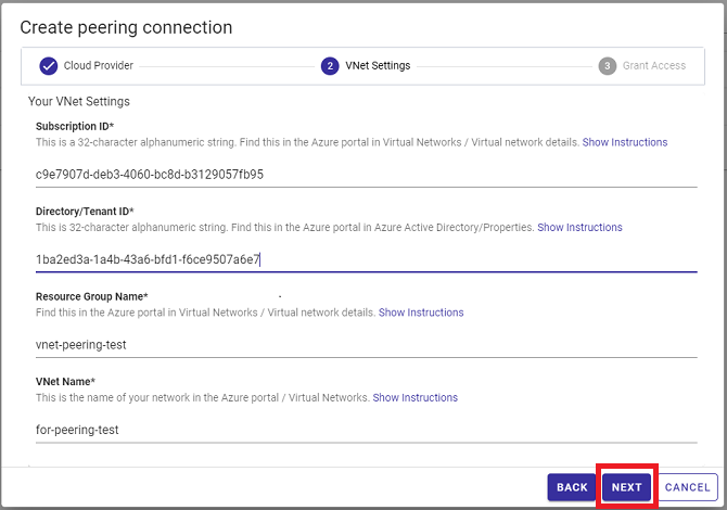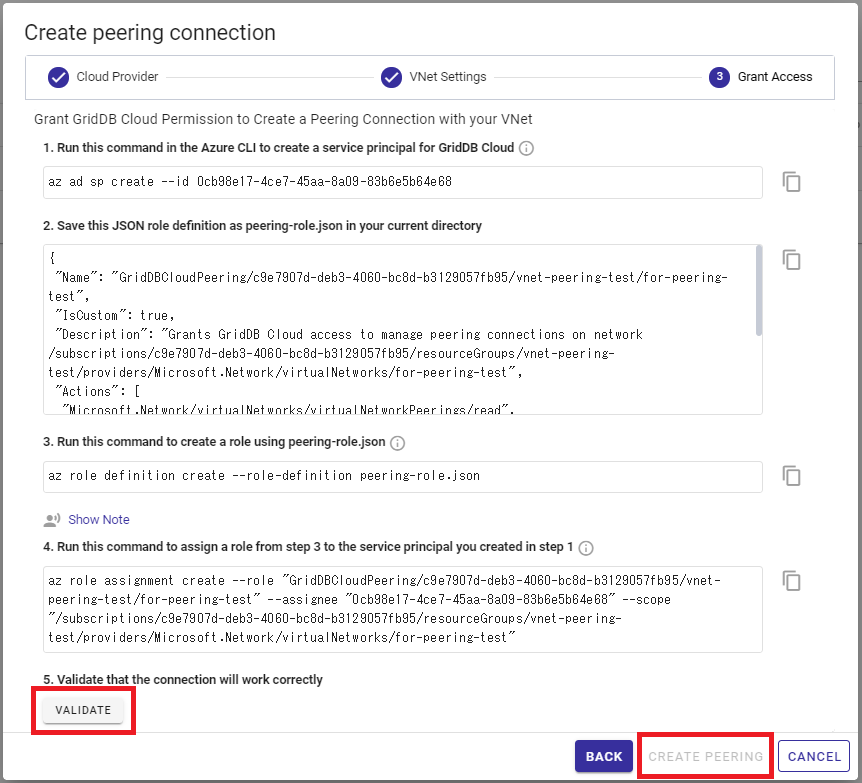 With these two crucial IDs ready, you can follow the GridDB Cloud wizard to create a peering connection with your Azure cloud provider.