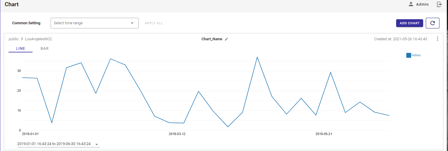 And of course, because GridDB is a time series database, the portal also has a chart viewer. If you click the Charts button from the sidebar menu, you can select a time range and view your data in either a line or bar chart. Very convenient!