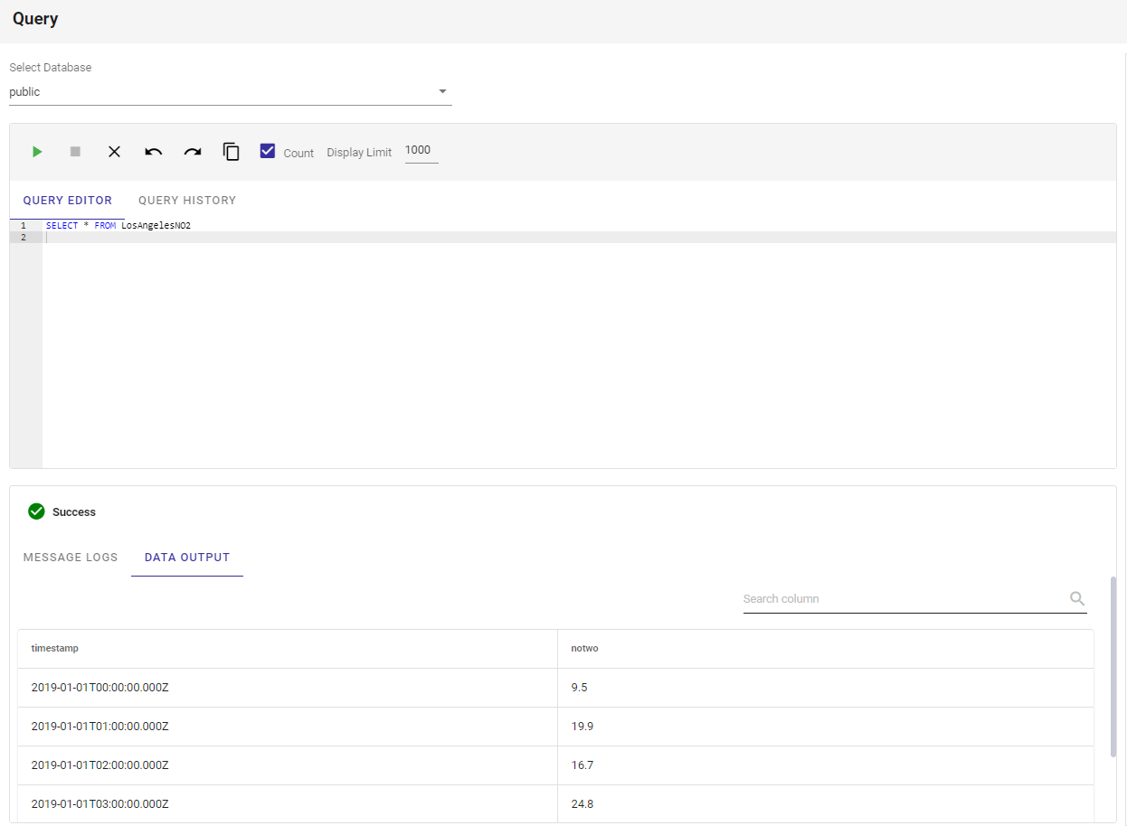 To go along with a simple view of all the data and its components, the online portal also contains an online query editor/viewer. This means you can make complex queries directly from the portal and view the output in the same page! To do this, simply click the Query navigation button in the side menu