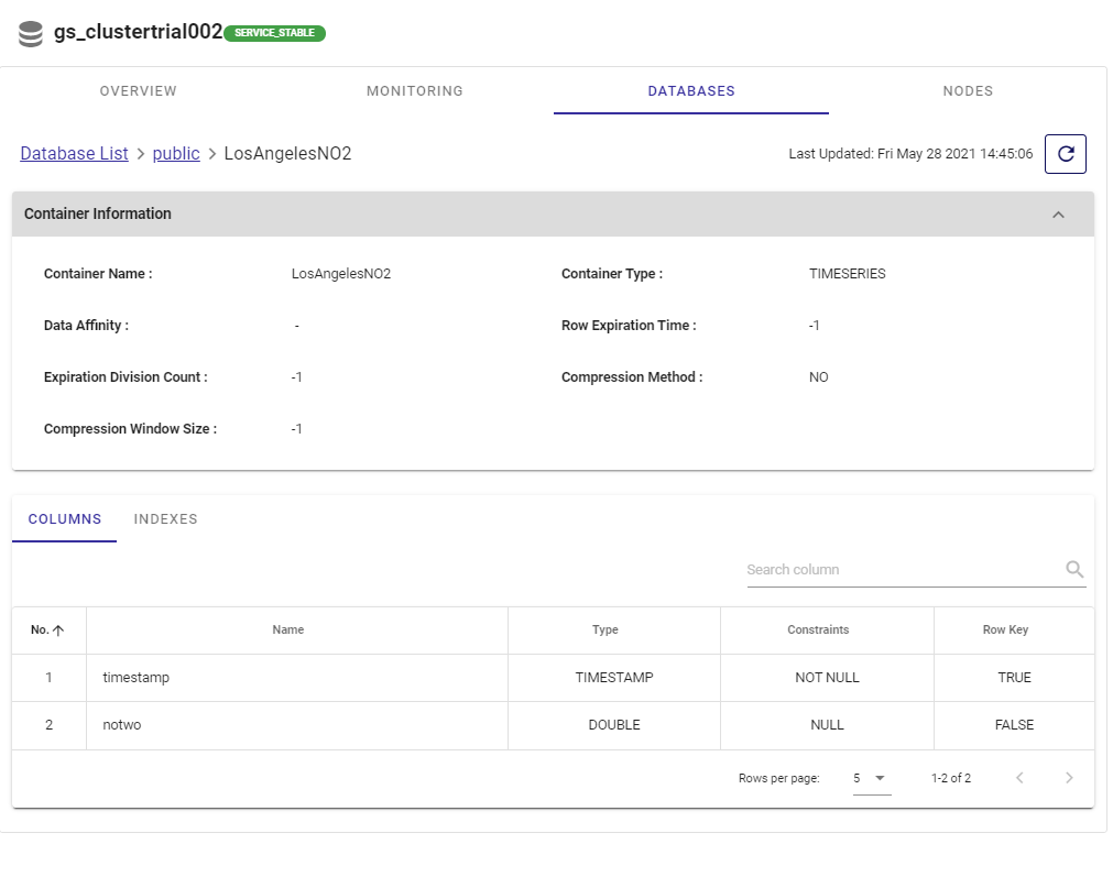 To look at the data from the portal, navigate yourself to the DATABASES header in the main page. At the bottom of this page will be a full list of your columns and even indexes.