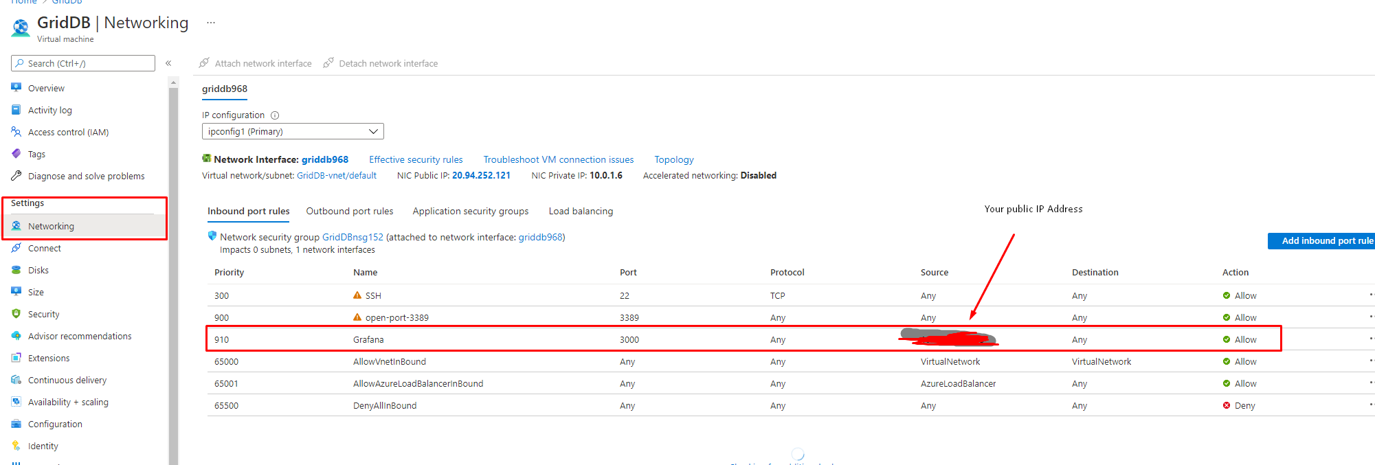 So, to be able to successfully use the GridDB Cloud instance as your backend, you run and install Grafana on your virtual machine (and make sure you open up the specific port in the Azure firewall to access the site locally). Here’s how to do it: How to open ports to a virtual machine with the Azure portal