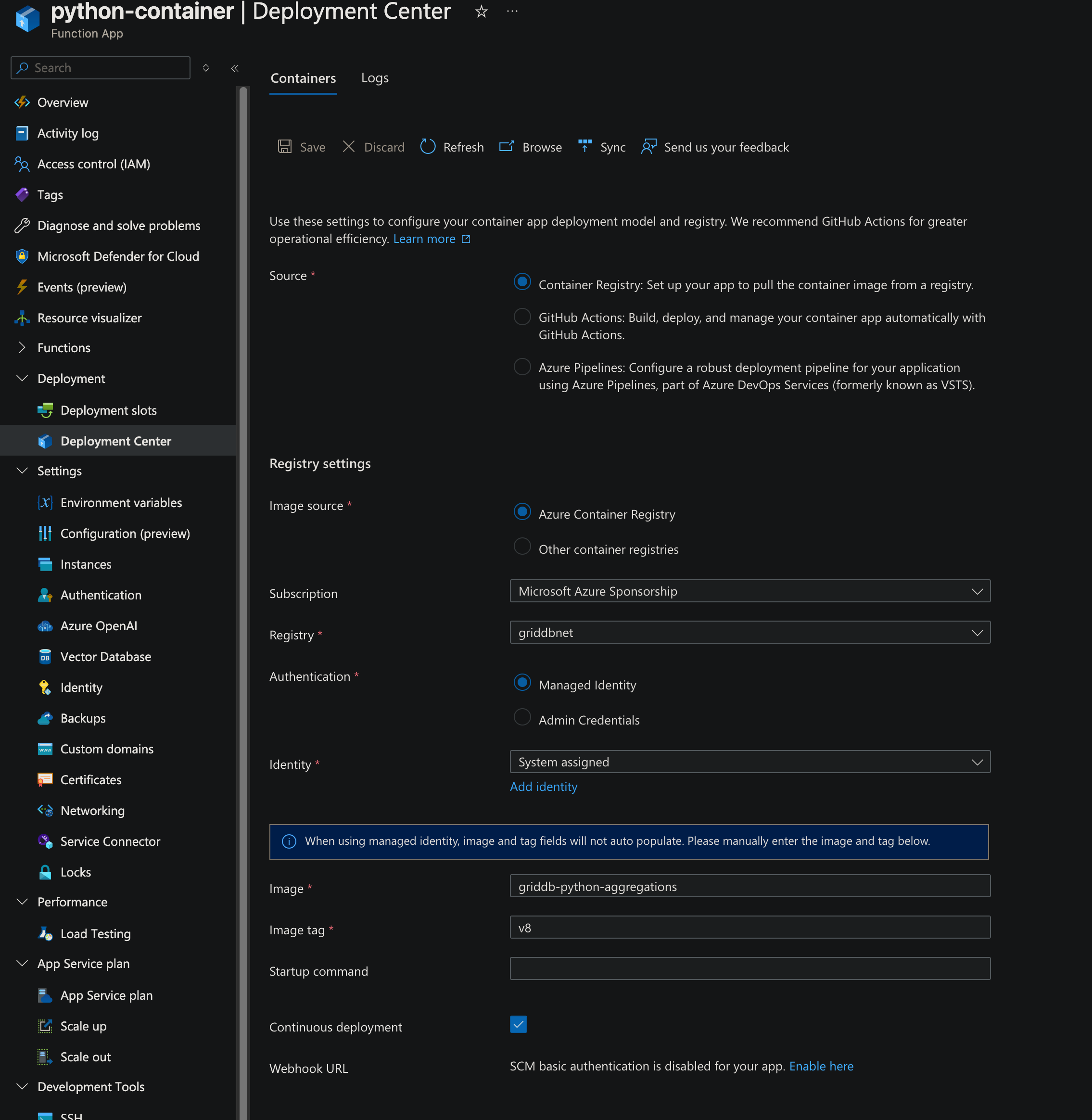 Once there, I went to the deployment center of my new python Azure Function and selected my container’s name etc. From there, it will deploy and run based on your stipulations. Cool!