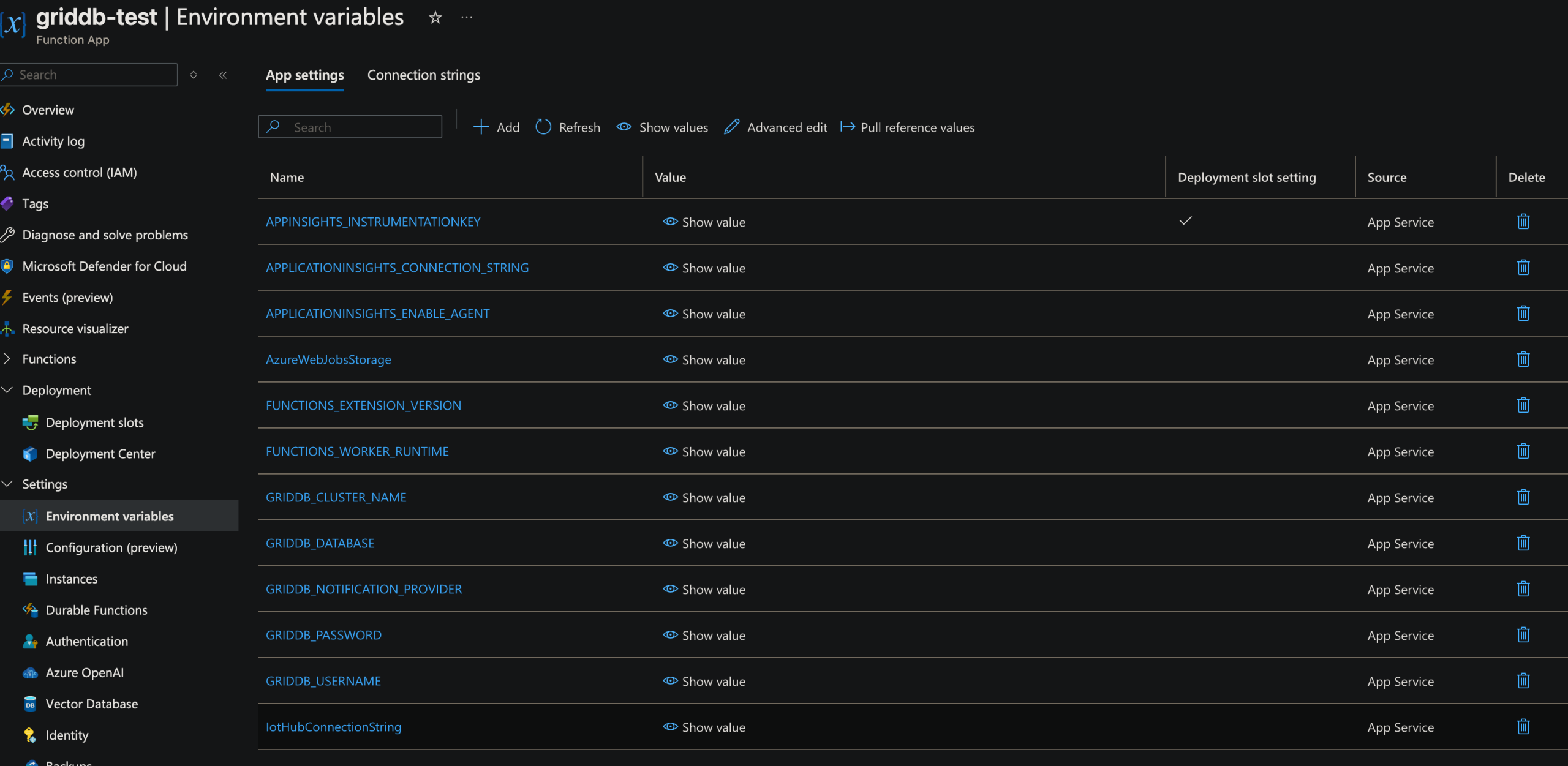 So in your Azure Function, when you create it, you should head to Settings -> Environment Variables. And set the IoTHubConnectionString as well as your GridDB Cloud credentials.