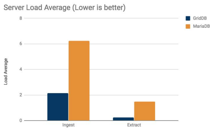 As previously mentioned, resource use was also measured and recorded during these tests. GridDB was able to perform at much higher levels while using up less CPU and memory resources.
