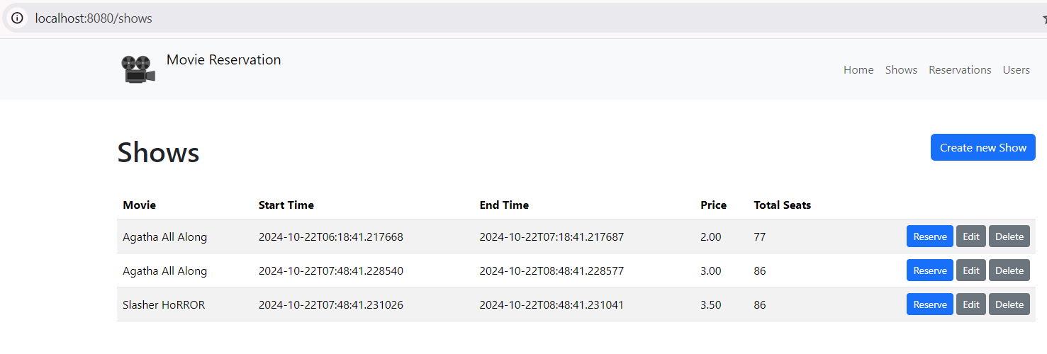 To make reservations, operator click Reserve button from the shows listing.