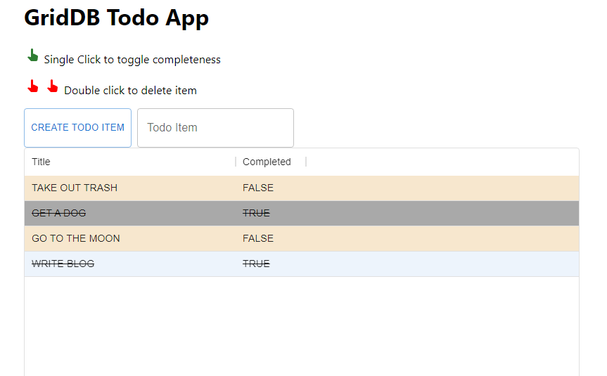 Once your project is running, simply navigate to port 8080 of the host machine (ie, http://localhost:8080 if the host machine is the same one as your web browser). And now you can create a TODO item in the box. To toggle as COMPLETED (or vice versa), simply click on the row. And because the data is being saved onto a database (GridDB), the TODO list will persist through shutdowns, etc.