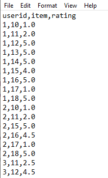 The work of the recommender system will be to recommend items to a user. The dataset to be used is organized in three columns, UserID, Item Number, and Rating. Thus, a column with values “4, 12, 3.0” means that the user with an ID of 4 has rated item 12 as 3 stars. The dataset is stored in a .CSV file, but we will move it to GridDB and pull it from there for building a recommender system.