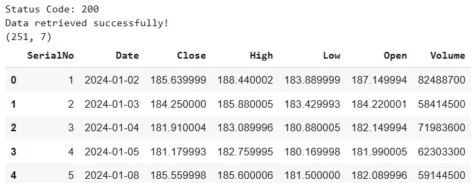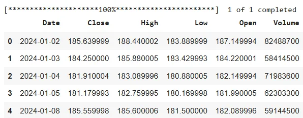 The above output indicates that the dataset comprises the daily closing, opening, high, low, and volume prices for Apple stock.