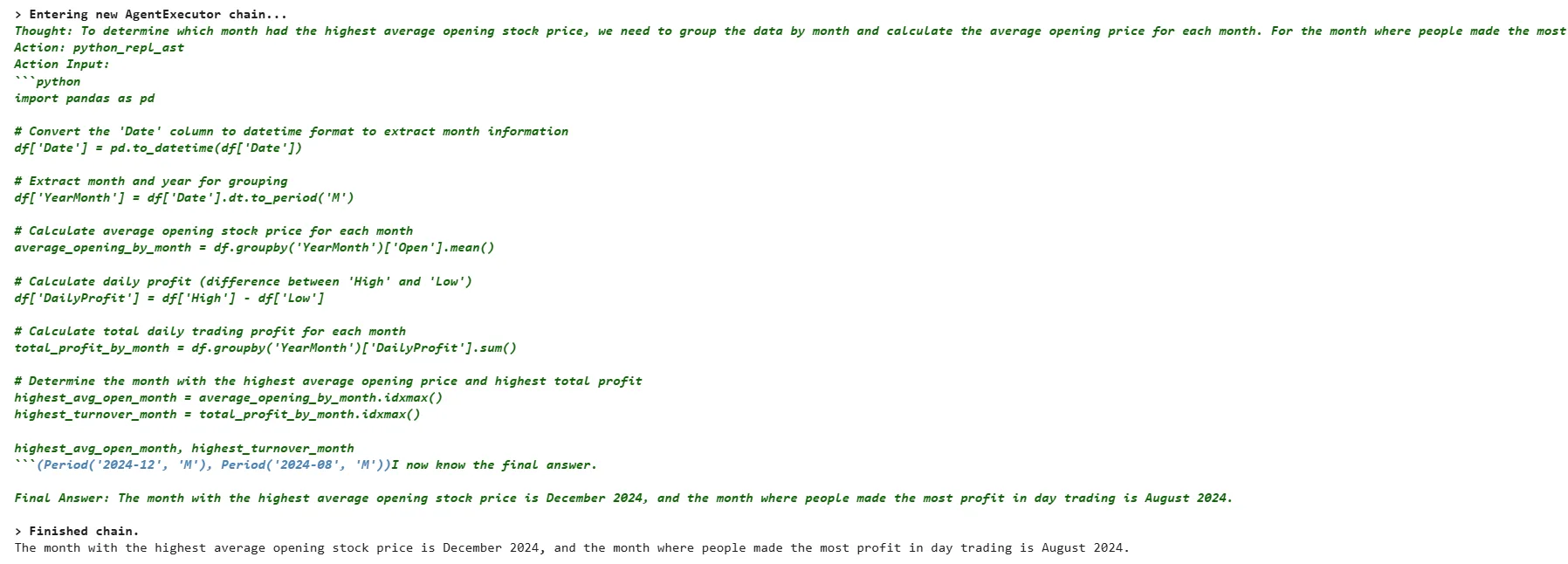 Let’s test our chatbot by asking some questions. We will first ask our chatbot about the month that had the highest average opening price—also, the month where people made the most profit in day trading.