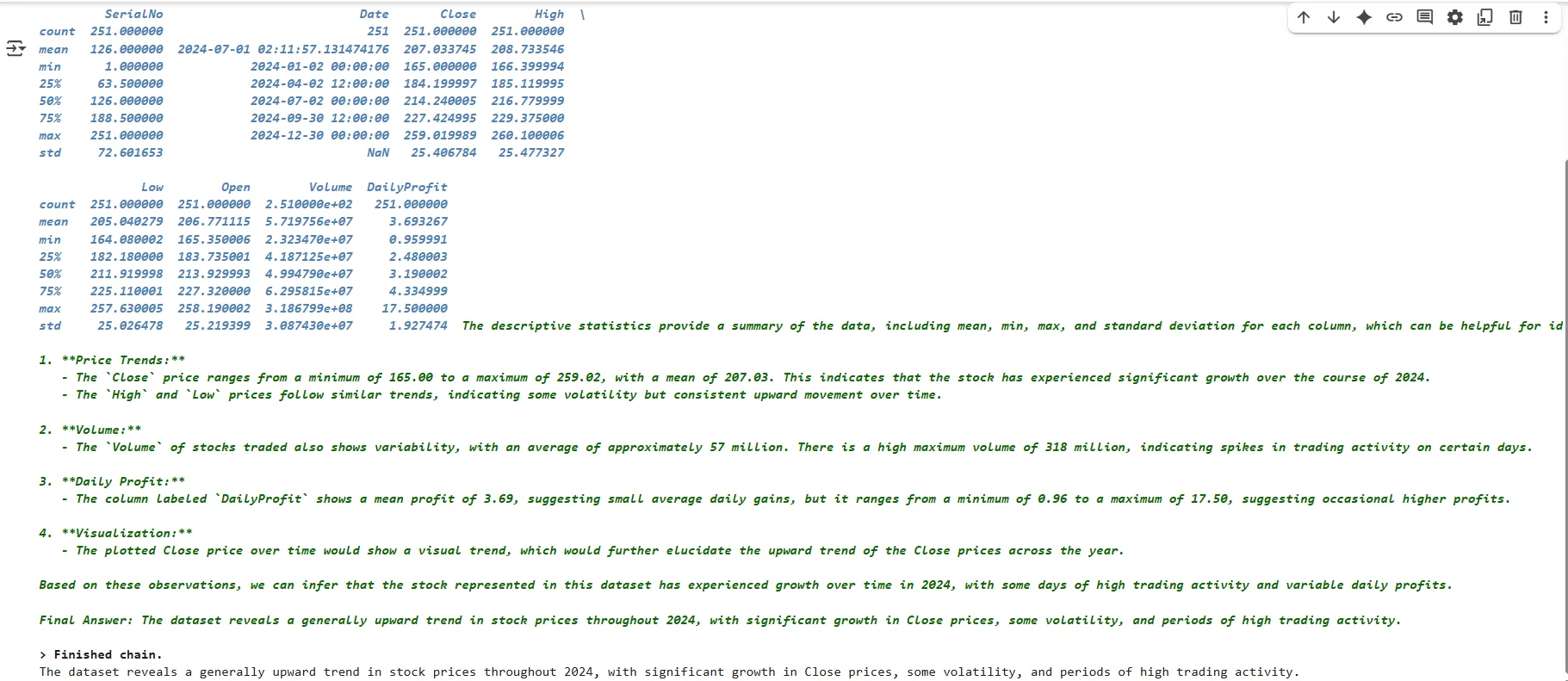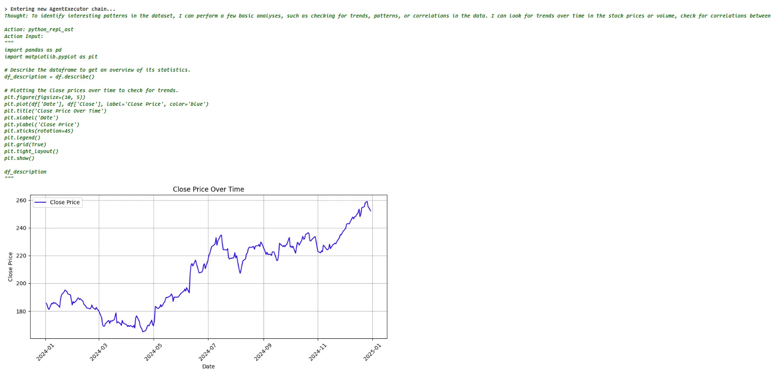 The above output shows the first part of the reply. You can see that the chatbot is intelligent enough to draw a plot for the closing prices to identify interesting patterns.