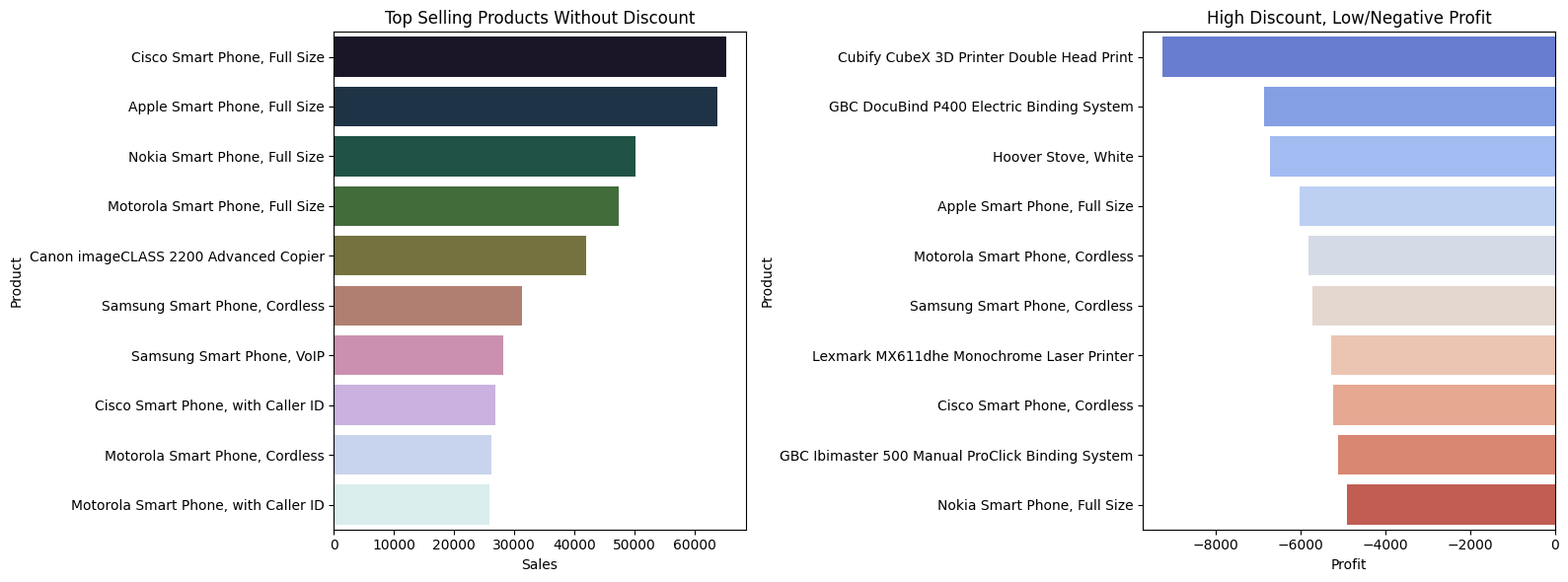 axes[0].set_title("Top Selling Products Without Discount")