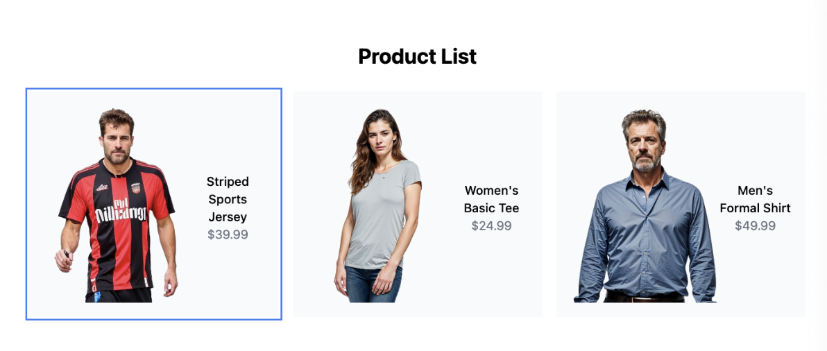 This component shows all the clothes products. For simplicity, the product list data is from static data: