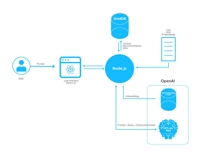 - The user inputs a prompt (e.g., their preferences or requirements for clothing) through a React.js based User Interface.