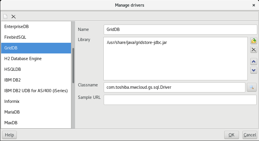 First, input a name for the driver, such as “GridDB”, and then use the file selection dialog to find and input the JAR location. In our case it’s /usr/share/java/gridstore-jdbc.jar and for us, it auto-filled the class path.