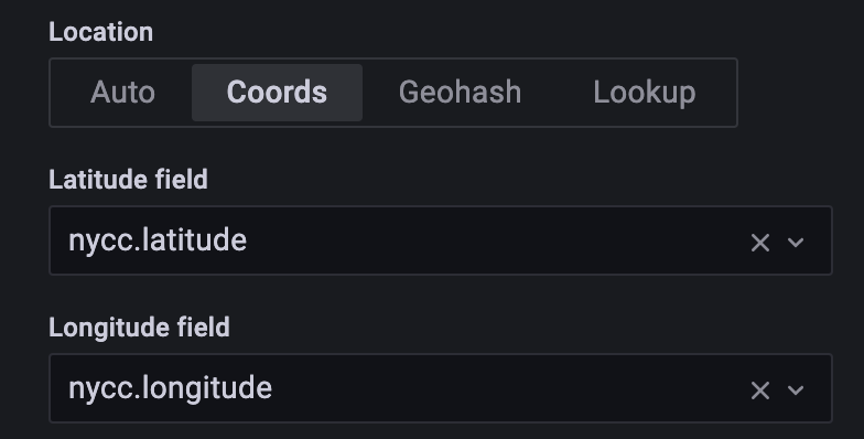 After that, we need to tell our Grafana instance that we would like to use coordinates as our data type. So change the option from Auto to Coords. You will then specify the actual name nycc.latitude and nycc.longitude