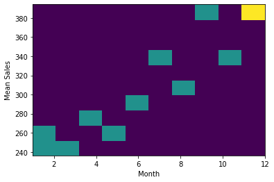 First we use a simple line plot with year-month on the x axis and sales on the y axis. The figsize determines the size of the figure, line style determines the type of line we use, markers tells us which marker to use (s for squares). The colors for the line and markers can be set using the colour and markerfacecolor option respectively and the size of the marker can be set with markersize. Furthermore we rename the labels of the plot. More references to the various arguments that can be passed to plot can be found here.