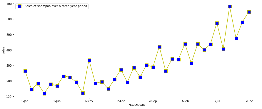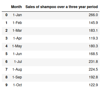 We will use a publicly available dataset from Kaggle. For this post we have picked the shampoo sales data. This dataset contains sales of shampoo over a three year period at the month level. Thus, the two columns in this dataset are sales and month-year.