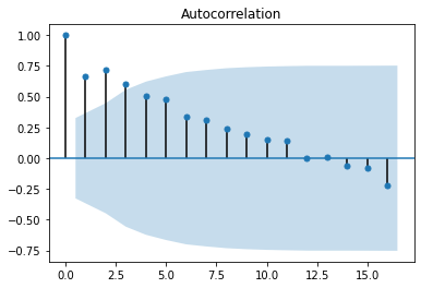 We see that there is a positive autocorrelation in the dataset for low lags. The higher lags don't make sense as we have data for only three years. A nicer plot is provided by the statmodel library.