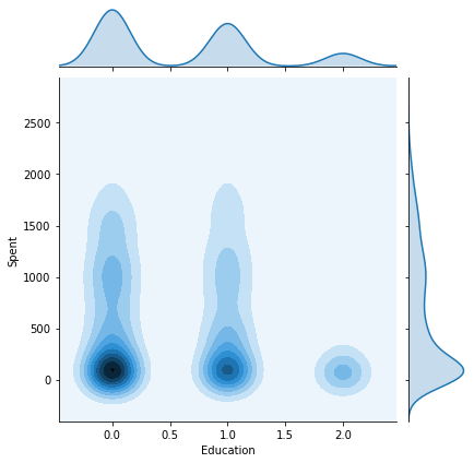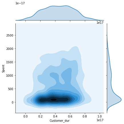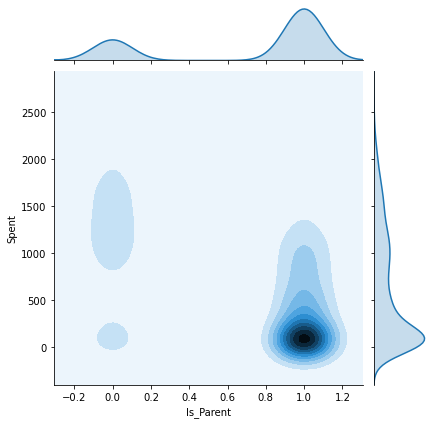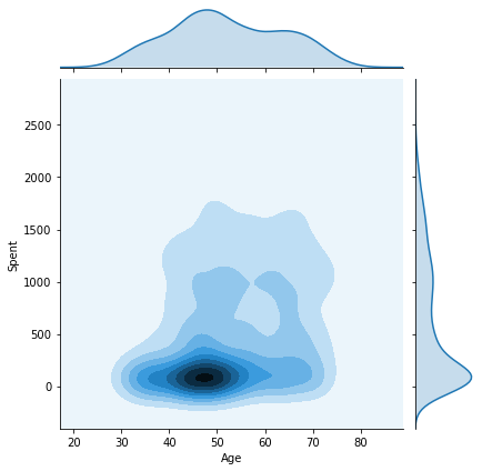 sns.jointplot(x=data[col], y=data["Spent"], hue=h, kind="kde")