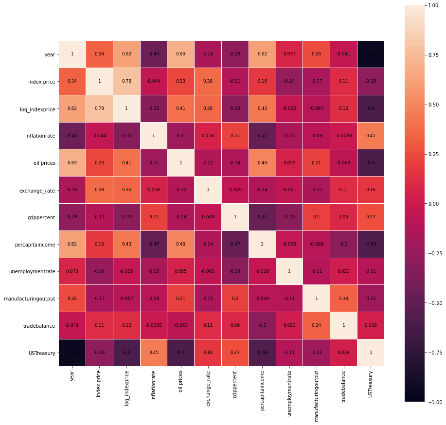 Since most features in this dataset are numerical, a Regression Model would be best suited for the scenario. We are considering Linear Regression Model for the sake of simplicity. You can try Polynomial Regression as well. The log_indexprice is taken as the dependent variable. For the independent variable, it can be interesting to see if the inflationrate can be used to predict log_indexprice.