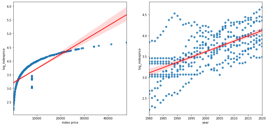 As expected the feature index price is the most correlated with log_indexprice as the latter is just the log value of the former. Additionally, we see that year and percapitaincome are high to moderately correlated with log_indexprice.
