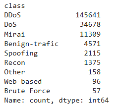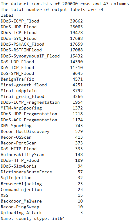 The above output shows all the 34 intrusion types in our dataset with DDoS-ICMP_FLOOD being the most frequently occurring intrusion while Uploading_Attack is the least frequently occurring intrusion type.