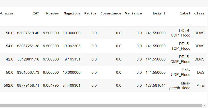 The dataset consists of different types of IoT intrusions. the following script imports the dataset into a Pandas dataframe.