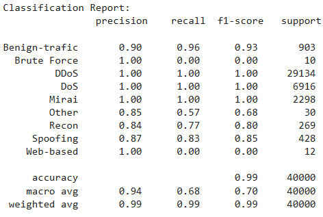 The above output shows that our model achieves an accuracy of 99% on the test set. It is important to note that since Brute Force had only 47 instances in the training set, the model is not able to learn much about this category.
