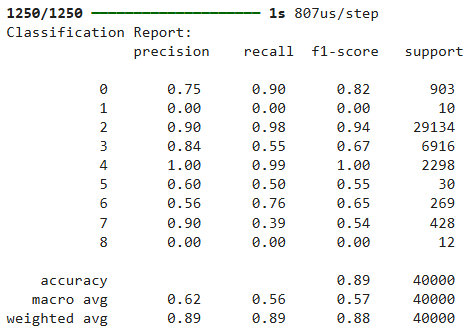 The above output shows that we achieve an accuracy of 89% on the test which is much less than what was achieved using the Random Forest algorithm. The reason can be that tree algorithms such as Random Forest are known to perform better on the tabular dataset. Furthermore, the performance of deep learning models is significantly impacted by data imbalance.