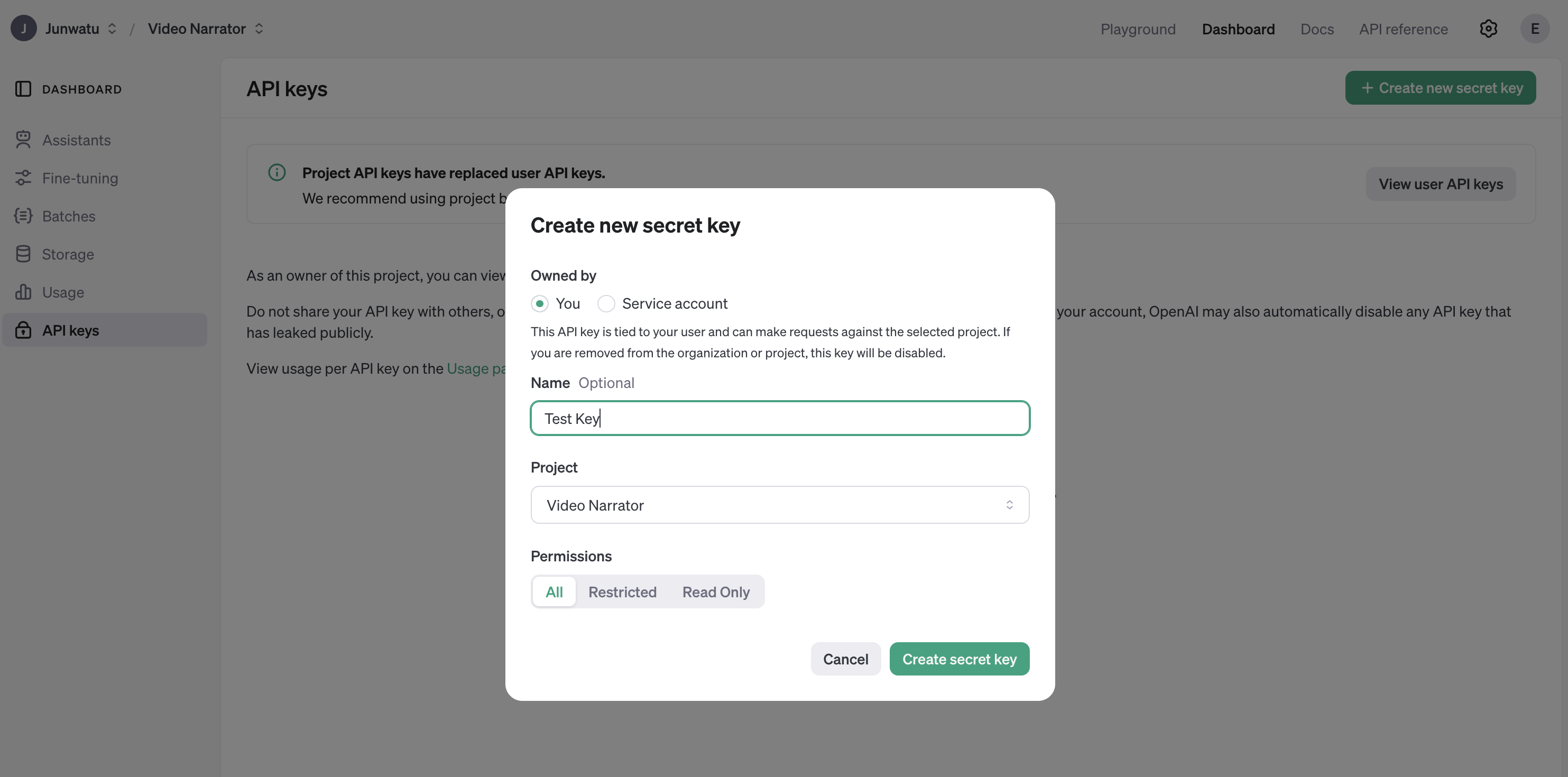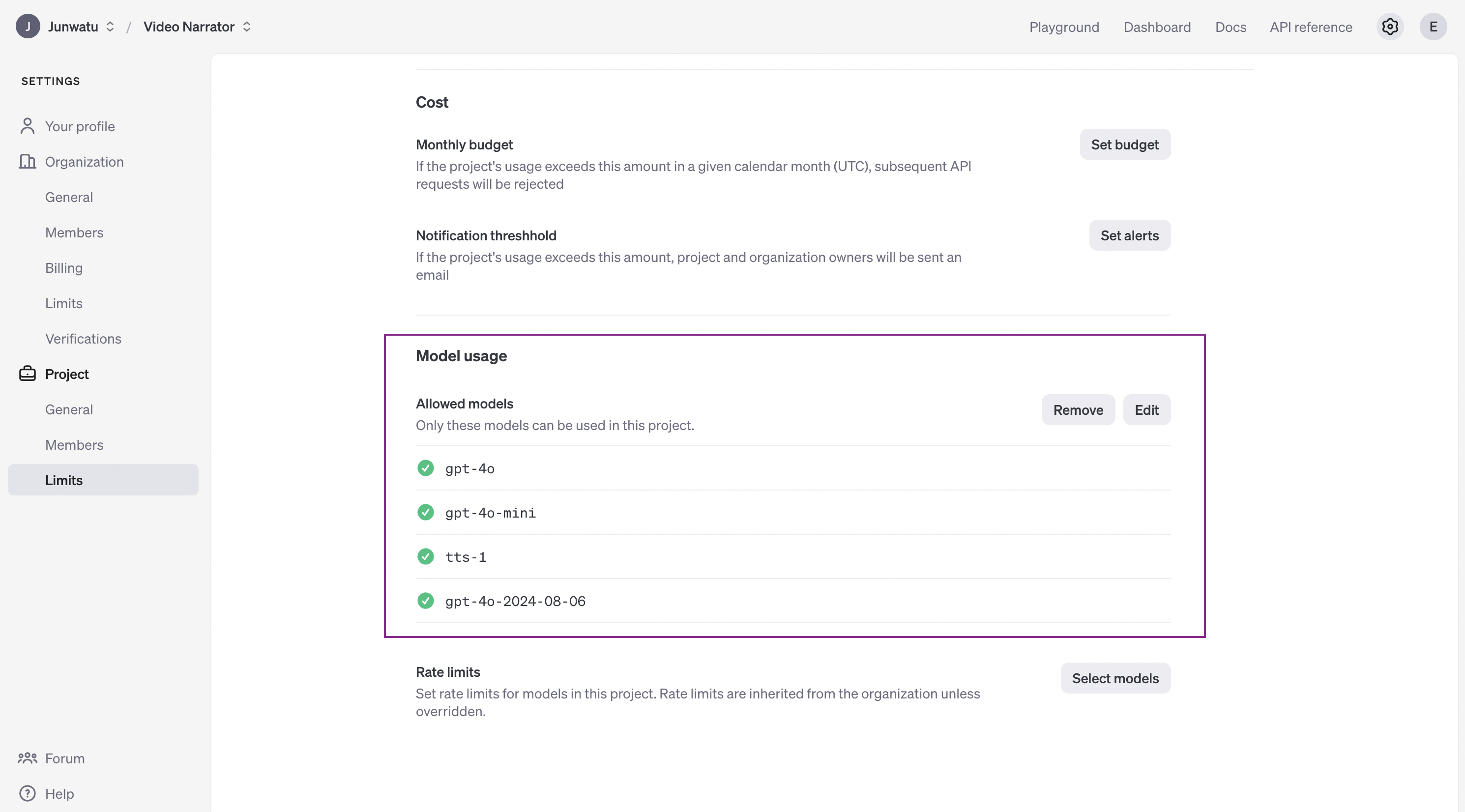 The OpenAI key is on a project basis, so we need to create a project first in the OpenAI platform and you need also to enable any models that you use on a project. For this project, we will need gpt-4o or gpt-4o-2024-08-06, gpt-4o-mini and tts-1 models.