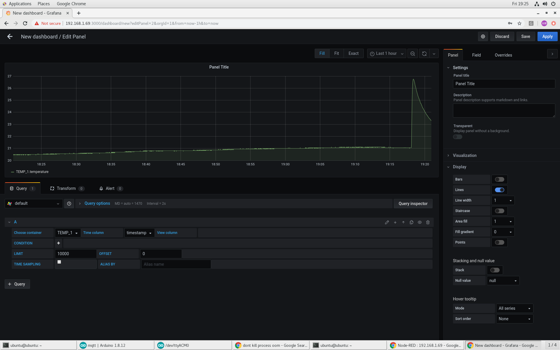 With the data source working, we can create a panel in a dashboard. We select which container to view and and the time series column and the data is plotted. Grafana makes it easy to zoom in and out of the data ranges to examine details or explore long term trends.