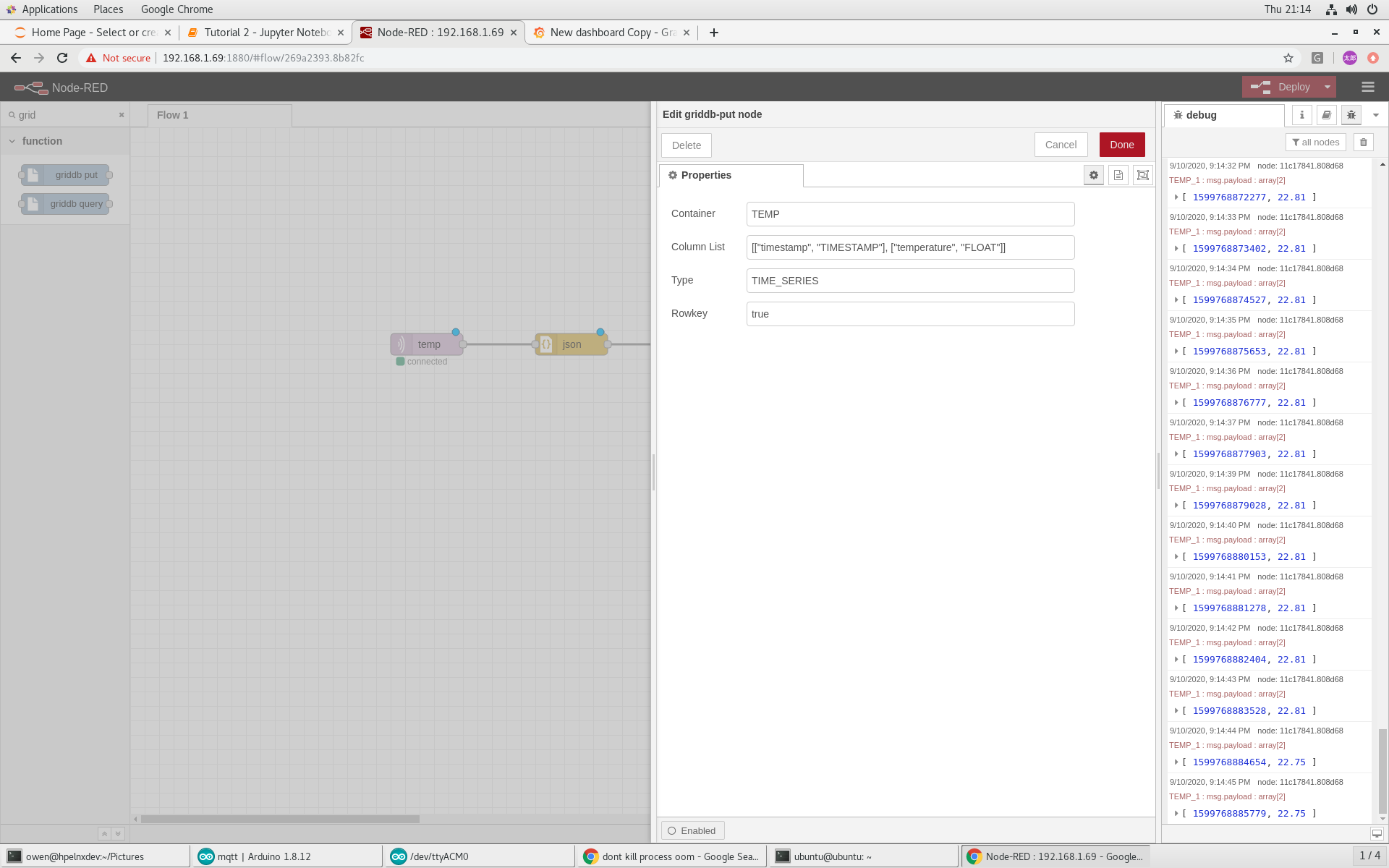 In this demonstration, we show how you to build a low cost Industrial Internet of Things (IIoT) solution using GridDB on a Raspberry Pi 4 with a Node-Red flow that uses MQTT to read temperature sensor data from an Industrial Shields M-DUINO 21+ Arduino PLC and then visualizes that data using Grafana.