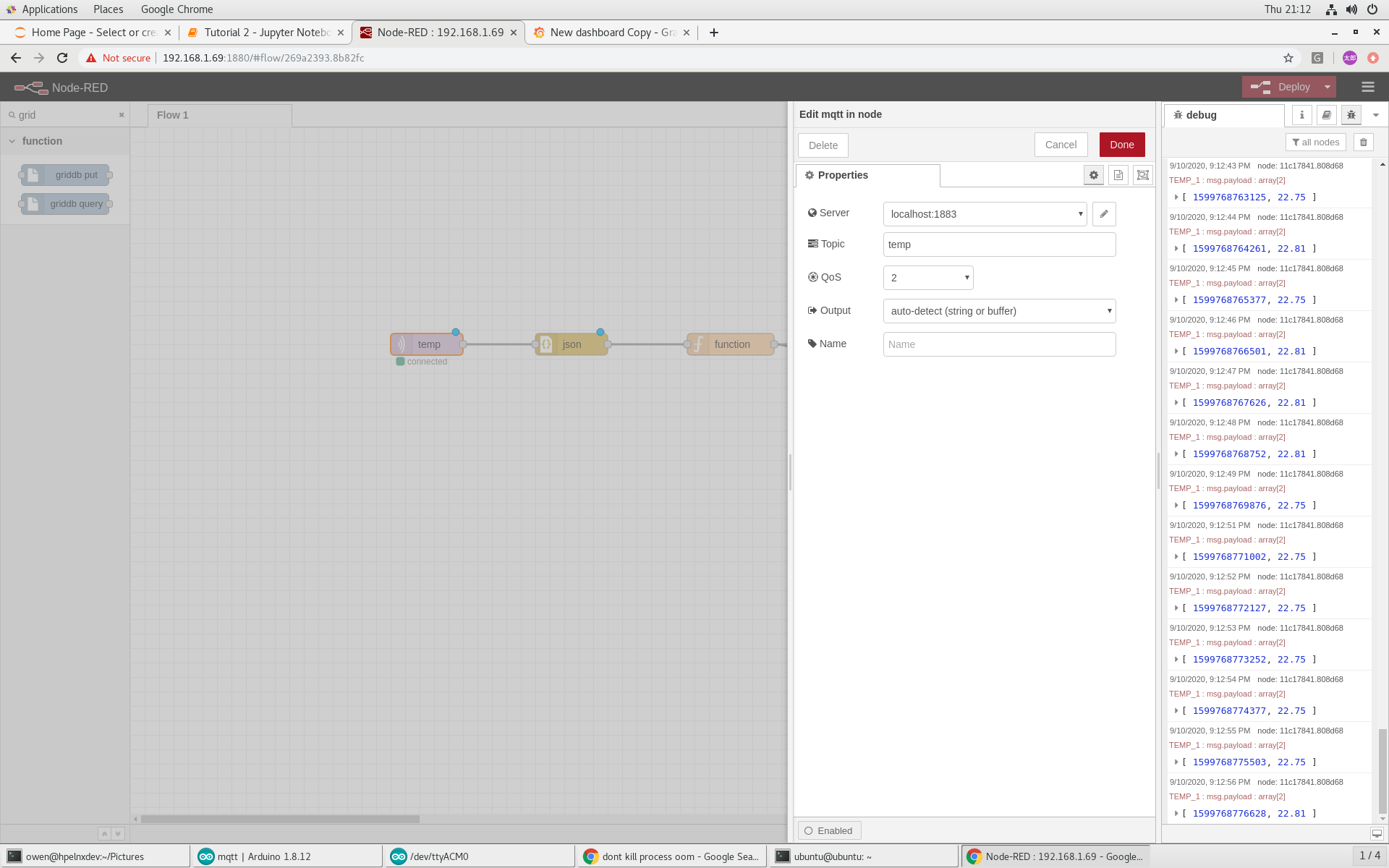 First we’ll add a MQTT listener in Node-RED that subscribes to the temp topic.