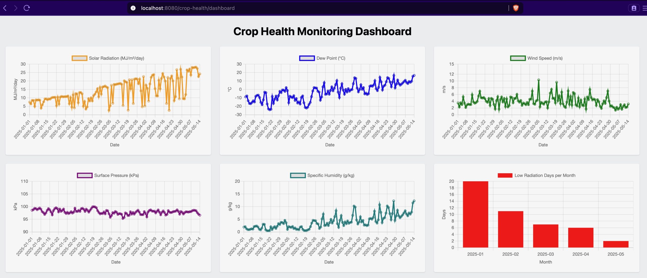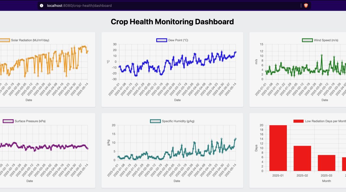 In this project, we focus on real-time crop health monitoring by processing environmental data and displaying important insights through visual dashboards, built with Spring Boot, GridDB Cloud, Thymeleaf, and Chart.js.