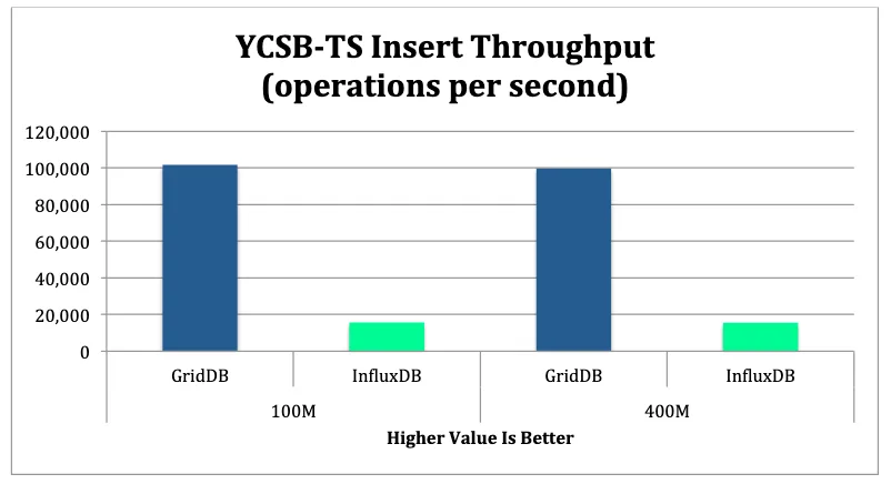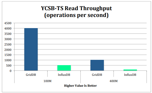 Fixstars recently performed benchmarks that compared time series databases GridDB and InfluxDB using one AWS instance with a CentOS 6.9 image. The tests were done using YCSB-TS framework, a fork of YCSB benchmarking tool meant for testing Time Series databases. The tests were ran with two datasets: one which could be held primarily in-memory (100M records) and one that would require performing disk I/O (400M records).