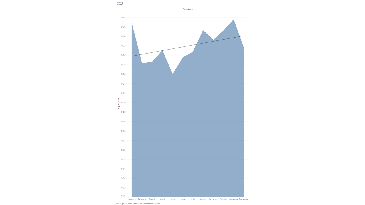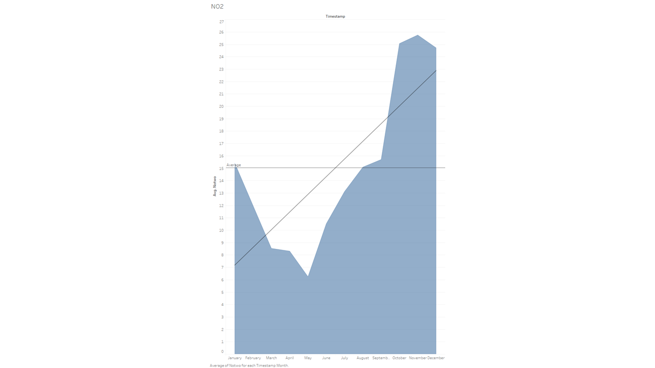 While the data does indeed show that co emissions go up above average during these months, I was a bit surprised it wasn’t that much higher. I would also like to point out that I included here what is called a linear trend line (the big line intersecting horizontally). It helps show the general direction of the data as the year progresses.