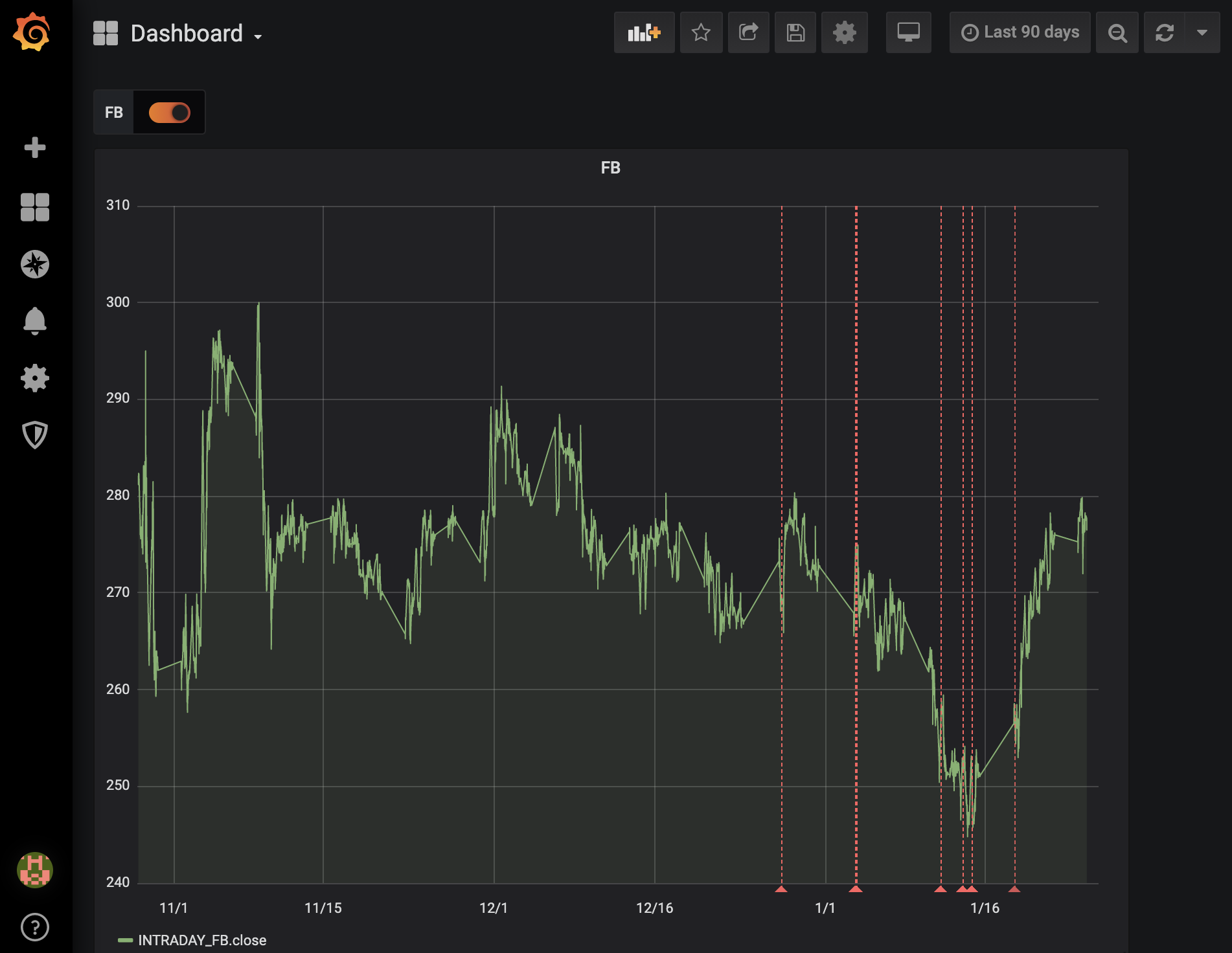 Now, create create one dashboard for every symbol we’re monitoring. Each dashboard will have one annotation that will mark each time an anomaly occured in the given stock. In this case, we’re looking at Facebook’s (FB) anomalies.