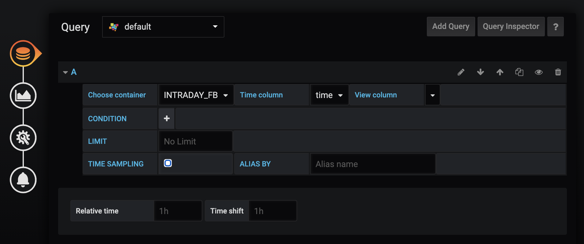 We will create a new panel and create the query, setting the container name to “INTRADAY_FB” and removing any limits on returned records. The default limit of 10000 will only give a few weeks of data.