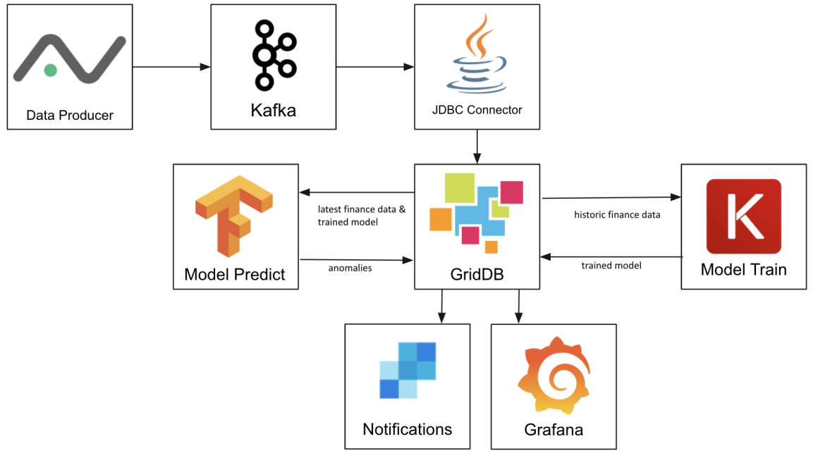 In this project, we use GridDB to create a Machine Learning platform where Kafka is used to import stock market data from Alphavantage, a market data provider. Tensorflow and Keras train a model that is then stored in GridDB, and then finally uses LSTM prediction to find anomalies in daily intraday trading history. The last piece is that the data is visualized in Grafana and then we configure GridDB to send notifications via its REST Trigger function to Twilio’s Sendgrid.
