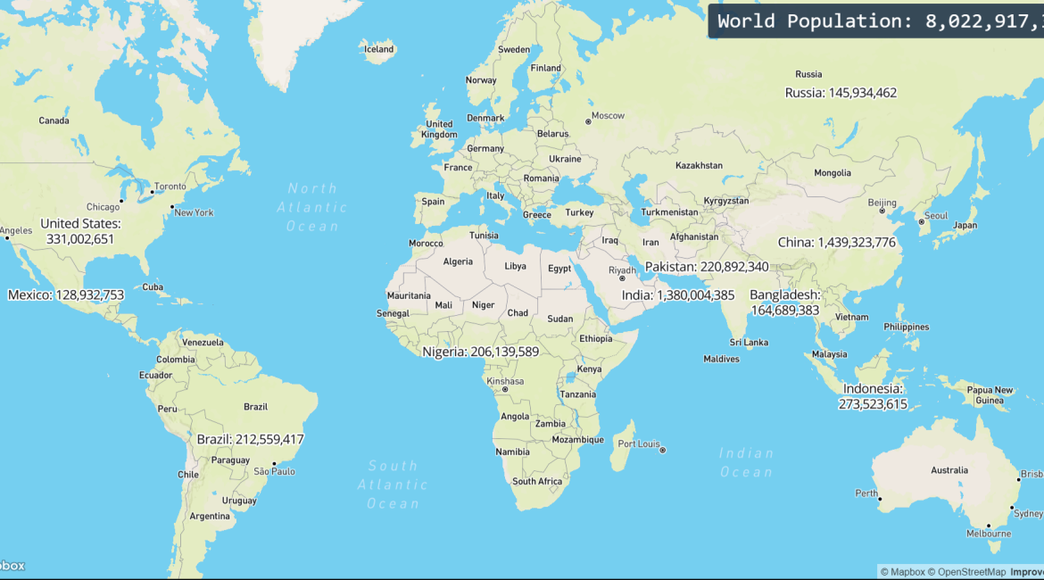 We use React.js to create the user interface and to display the world population data visually, we’ll use Mapbox GL JS, a powerful mapping library. This library enables the creation of interactive, customizable maps. We’ll integrate Mapbox GL JS with our React application to render a world map with labels representing the population data.