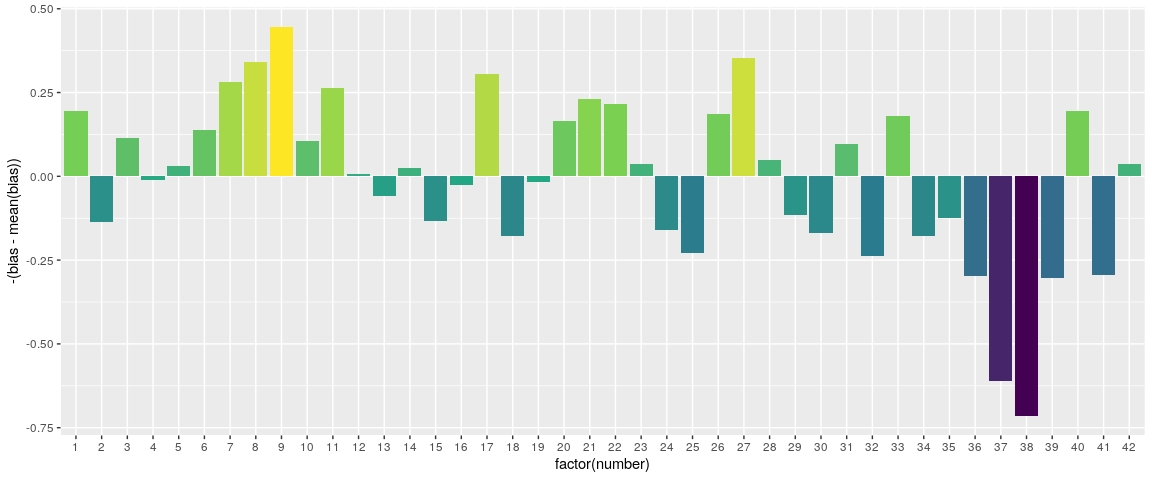 ggplot(hacky, aes(x = factor(number), y = -(bias - mean(bias)), fill = -bias)) + geom_col() +
