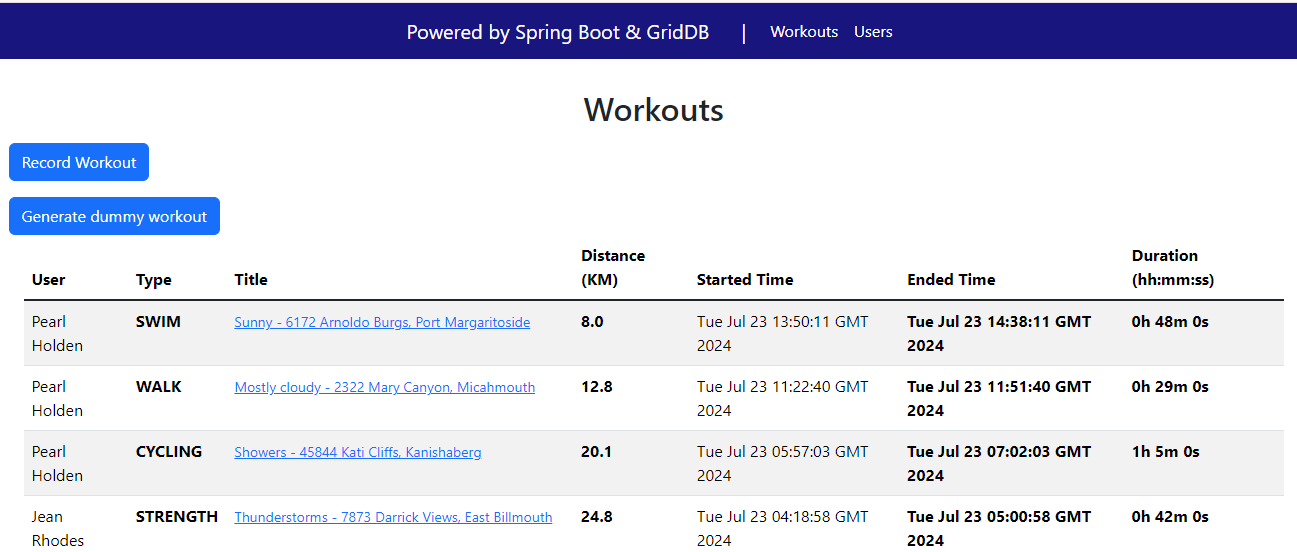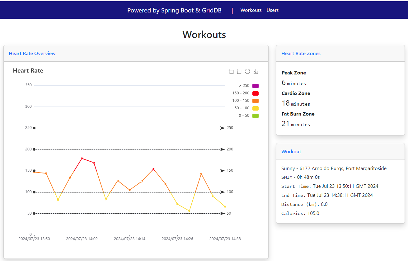 このチュートリアルでは、Spring Bootを使用して堅牢なMVCアプリケーションを作成する力を探求しました。GridDBをデータ永続化として統合する方法を示しました。Thymeleafのようなフロントエンド技術の統合は、Spring BootがさまざまなUIテンプレートに対応できる柔軟性を示しました。rawフィットネスデータを意味のある可視化に変換する方法を学びました。