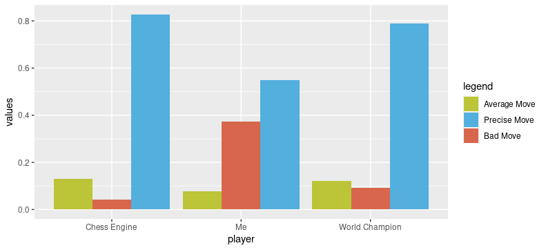最後に、すべてのプレーヤーが互いにどのように比較しているかを表示したいと思います。下の図は、エンジンが世界チャンピオンを明らかに上回っていることが分かります。しかし、最大の違いは、常に最善の手を打つということではなく、単純なオンラインエンジンがいかに稀にしかミスをしないかということです。しかも、私のようなアマチュア・プレイヤーは、平均して40%の確率で悪い手を打っているのです。