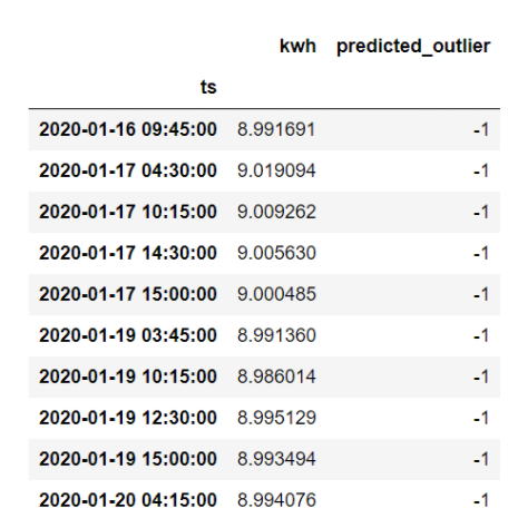 sensor_data.loc[sensor_data.predicted_outlier == -1, ['kwh', 'predicted_outlier']]