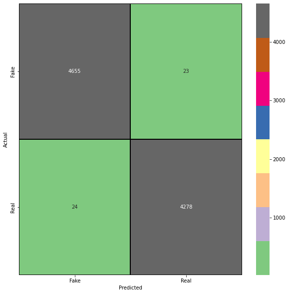 sns.heatmap(cm,cmap= "Accent", linecolor = 'black' , linewidth = 1 , annot = True, fmt='' , xticklabels = ['Fake','Real'] , yticklabels = ['Fake','Real'])
