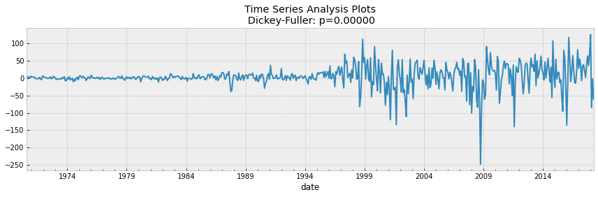 ts_ax.set_title('Time Series Analysis Plotsn Dickey-Fuller: p={0:.5f}'.format(p_value))