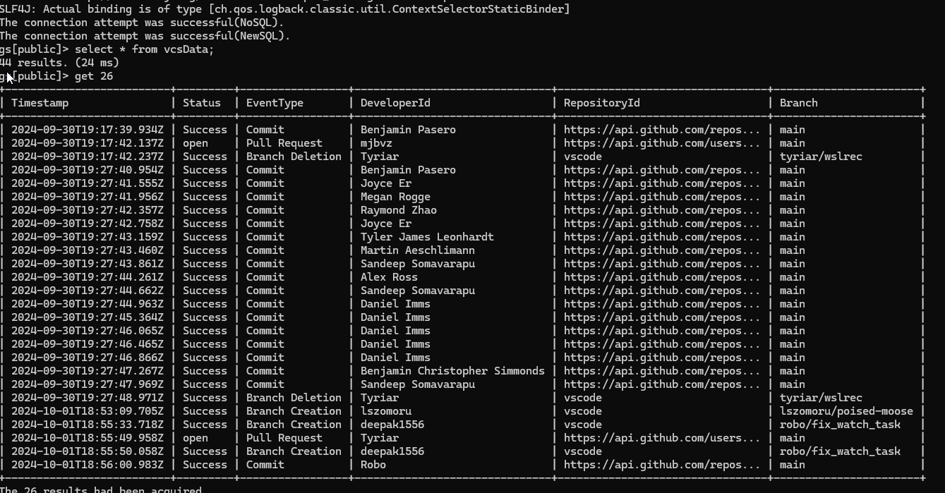 VCS活動の追跡は、チームのプロダクティビティを理解し、開発ワークフローを最適化するために不可欠です。GridDBのタイムシリーズデータ処理の効率性を活用することで、チームはコミット、マージ、プルリクエストなどの重要なイベントを容易に捕捉でき、リアルタイムの洞察と詳細な歴史的分析の両方を可能にします。