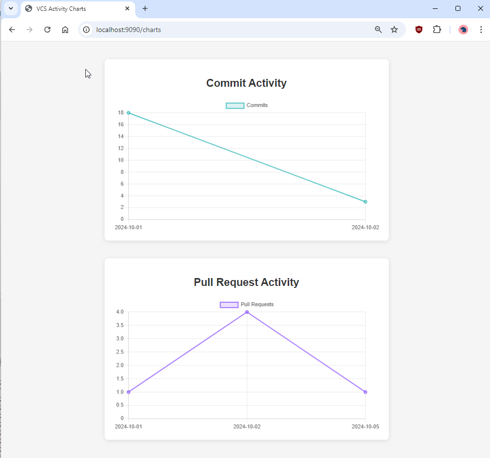 アプリケーションが起動したら、ウェブブラウザを開き、http://localhost:9090 にアクセスします。このURLには、コミット活動とプルリクエスト活動を時間軸で可視化したチャートを表示するThymeleafベースのダッシュボードが表示されます。