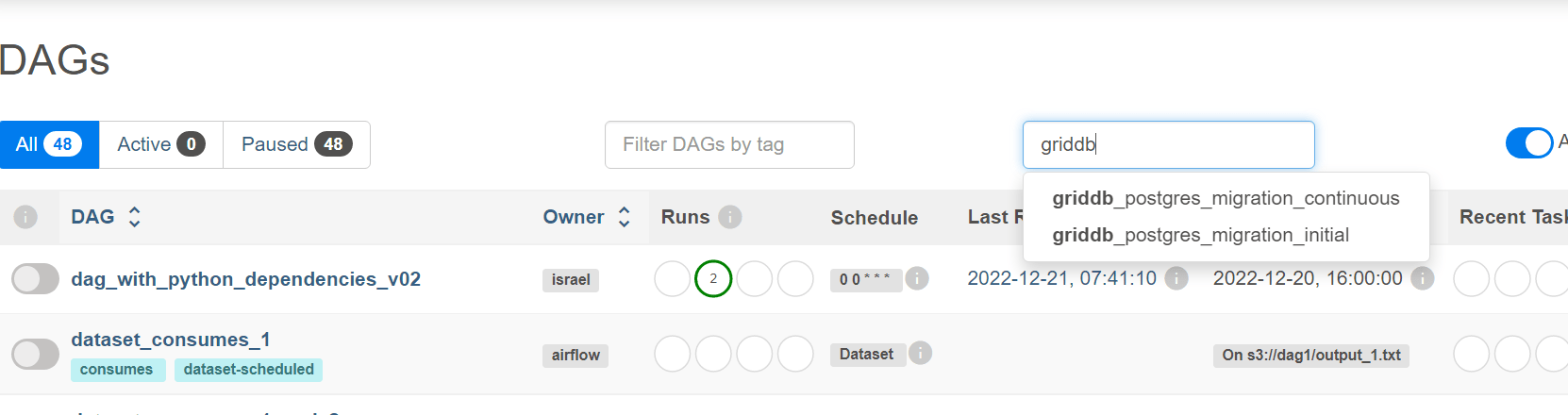 Let’s head back over to the UI and activate these DAGs. Our DAG which simply does an initial bulk migration is scheduled to run only once. Let’s turn that one on and make sure it runs. Use the search bar search DAGs and search GridDB.