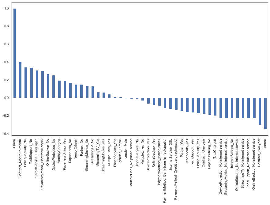 dataframe_dummies.corr()['Churn'].sort_values(ascending = False).plot(kind='bar')